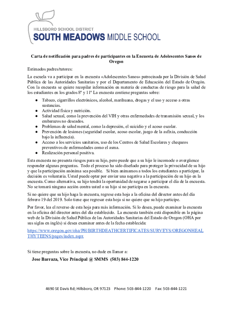 CARTA de notification para padres DE participants en la Ensues DE Adolescents Santos de