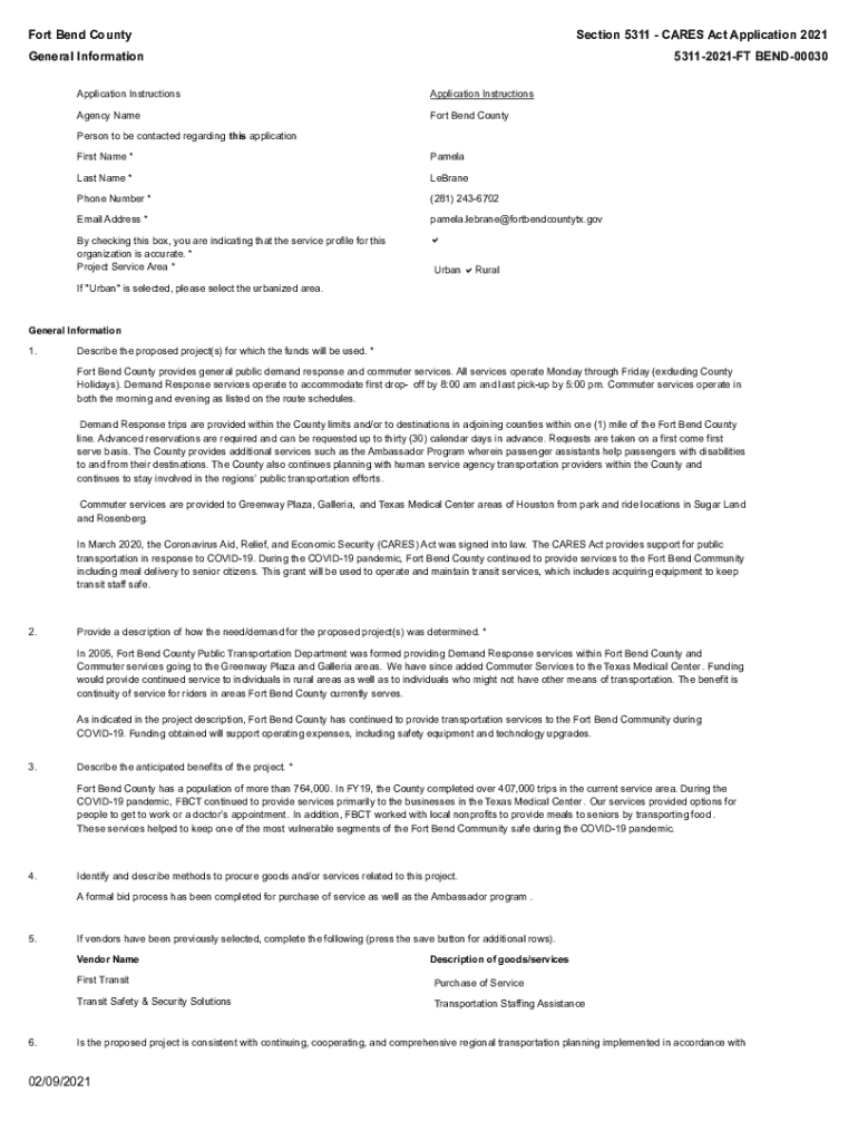 Fort Bend Counteraction 5311 CARES Act Application 2021General Information53112021FT BEND00030Application InstructionsApplication InstructionsAgency Comfort Bend Councilperson to be contacted regarding
