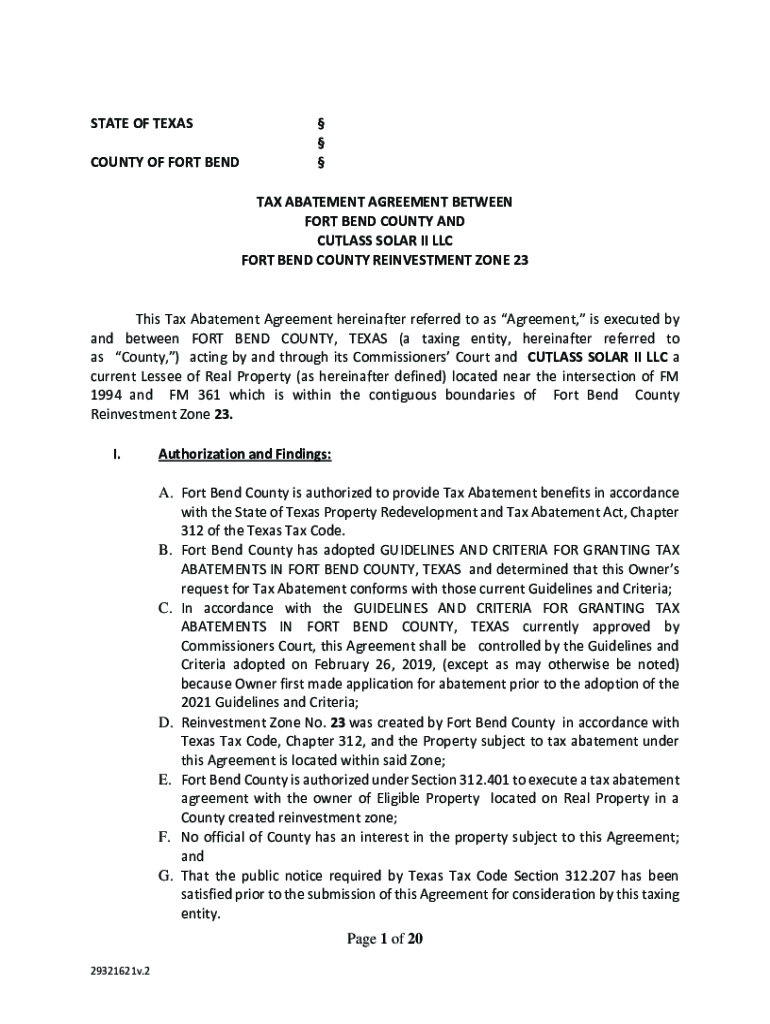 STATE OF TEXAS COUNTY OF FORT BEND TAX ABATEMENT AGREEMENT BETWEEN FORT BEND COUNTY AND CUTLASS SOLAR II LLC FORT BEND COUNTY REINVESTMENT ZONE 23This Tax Abatement Agreement hereinafter referred