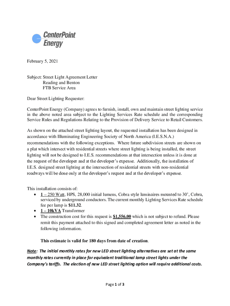 February 5, 2021Subject: Streetlight Agreement Letter Reading and Benton FT Service Area Dear Street Lighting Requester: Counterpoint Energy (Company) agrees to furnish, install, own and maintain