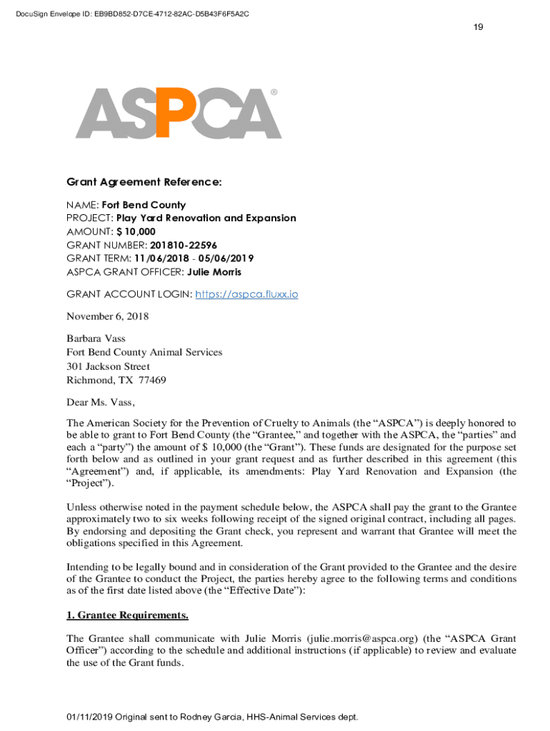 DocuSign Envelope ID: EB9BD852D7CE471282ACD5B43F6F5A2C19Grant Agreement Reference: NAME: Fort Bend County PROJECT: Play Yard Renovation and Expansion AMOUNT: $10,000 GRANT NUMBER: 20181022596 GRANT