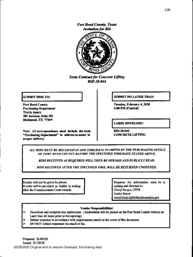 42BFort Bend County, Texas Invitation for Bid Ofo7;AND CCT Term Contractor Concrete Lifting BID 20044SUBMIT BIDS TO;SUBMIT NO LATER THAN:Fort Bend County Purchasing Department2:00 PM (Central)Tuesday,