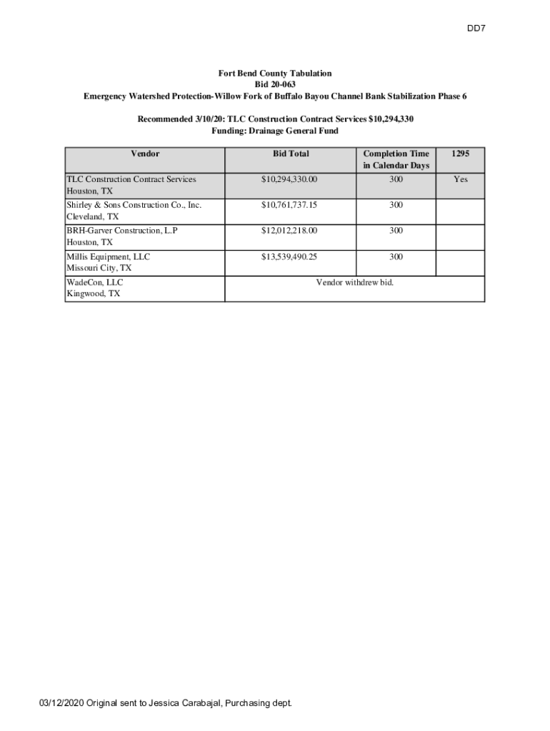 DD7Fort Bend County Tabulation Bid 20063 Emergency Watershed ProtectionWillow Fork of Buffalo Bayou Channel Bank Stabilization Phase 6 Recommended 3/10/20: TLC Construction Contract Services $10,294,330