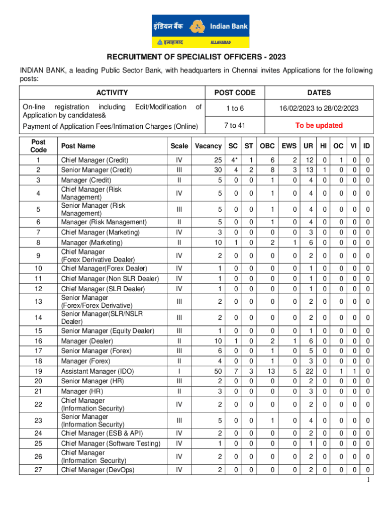 RECRUITMENT OF SPECIALIST OFFICERS 2023 INDIAN BANK, a leading Public Sector Bank, with headquarters in Chennai invites Applications for the following posts: ACTIVITY Online registration including