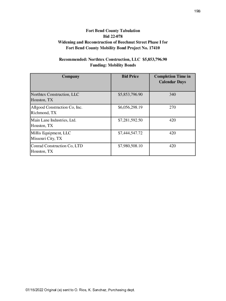 19BFort Bend County Tabulation Bid 22078 Widening and Reconstruction of Beechnut Street Phase I for Fort Bend County Mobility Bond Project No. 17410 Recommended: Norther Construction, LLC $5,853,796.90