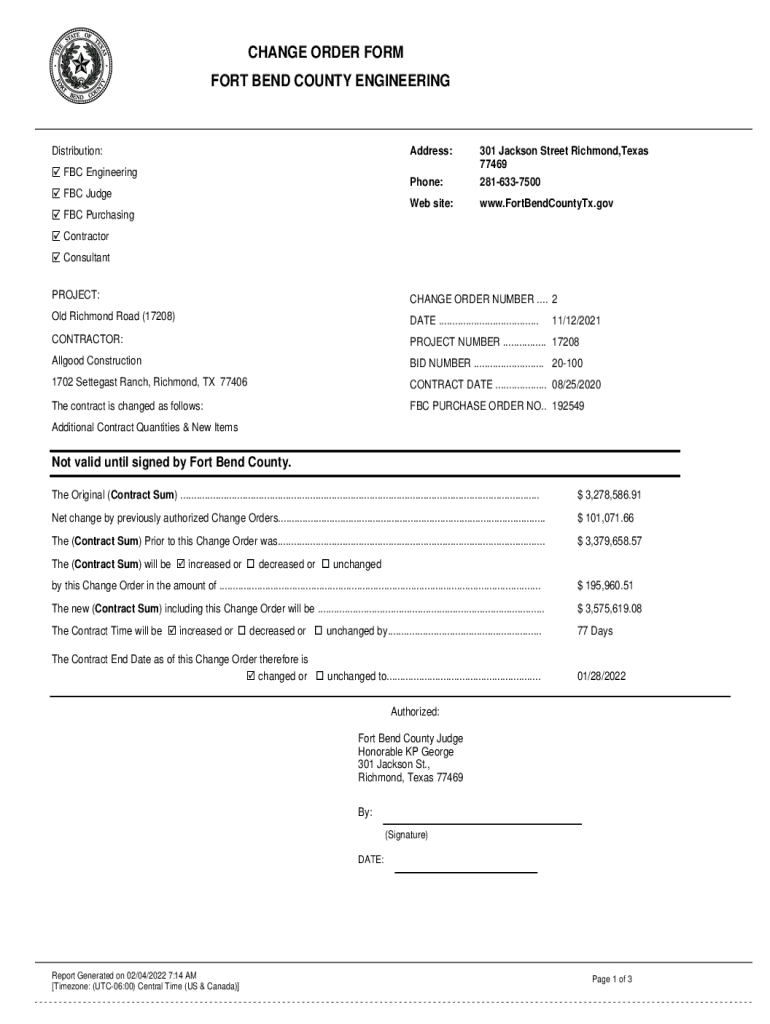CHANGE ORDER FORM FORT BEND COUNTY ENGINEERINGDistribution: BBC Engineering BBC Judge BBC PurchasingAddress:301 Jackson Street Richmond, Texas 77469Phone:2816337500Web site:www.FortBendCountyTx.gov
