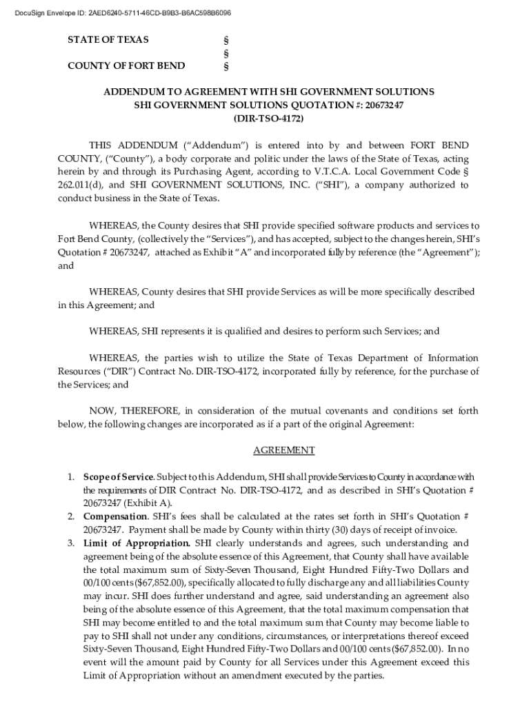 DocuSign Envelope ID: 2AED6240571146CDB9B3B6AC598B6096STATE OF TEXAS COUNTY OF FORT BEND ADDENDUM TO AGREEMENT WITH SHI GOVERNMENT SOLUTIONS SHI GOVERNMENT SOLUTIONS QUOTATION #: 20673247 (DIRTSO4172)