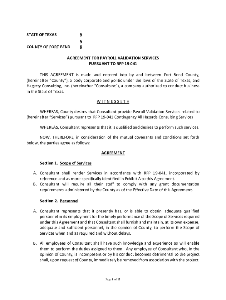 STATE OF TEXAS COUNTY OF FORT BEND AGREEMENT FOR PAYROLL VALIDATION SERVICES PURSUANT TO RFP 19041 THIS AGREEMENT is made and entered into by and between Fort Bend County, (hereinafter County), a