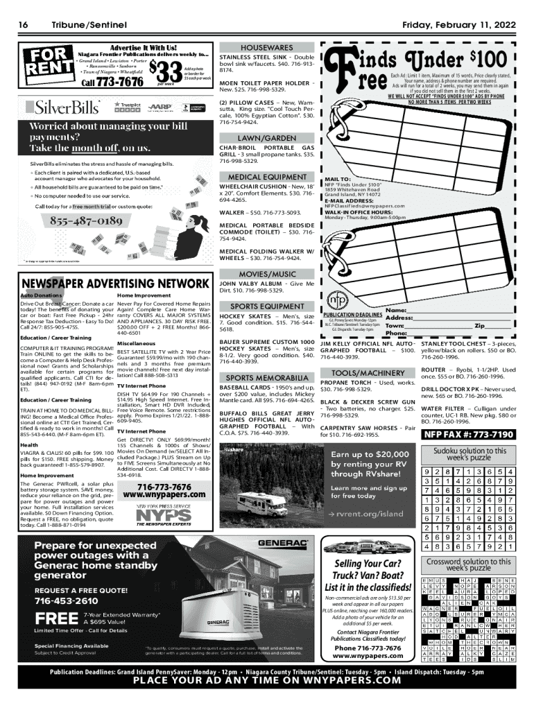16Friday, February 11, 2022Tribune/Sentinel Advertise It With Us! Niagara Frontier Publications delivers weekly to... /ZIVL1[TIVL4M_Q[WV8WZMZ :IV[WU^QTTM;IVANOV W_VWN6QIOIZI?PMIMTLCall $773767633Add
