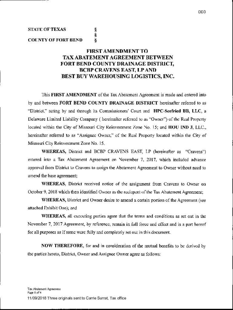 DD3STATE OF TEXASCOUNTY OF FORT HEADFIRST AMENDMENT TO TAX ABATEMENT AGREEMENT BETWEENFORT BEND COUNTY DRAINAGE DISTRICT, CBP CRAVENS EAST, LP AND BEST By WAREHOUSING LOGISTICS, INC. This FIRST AMENDMENT