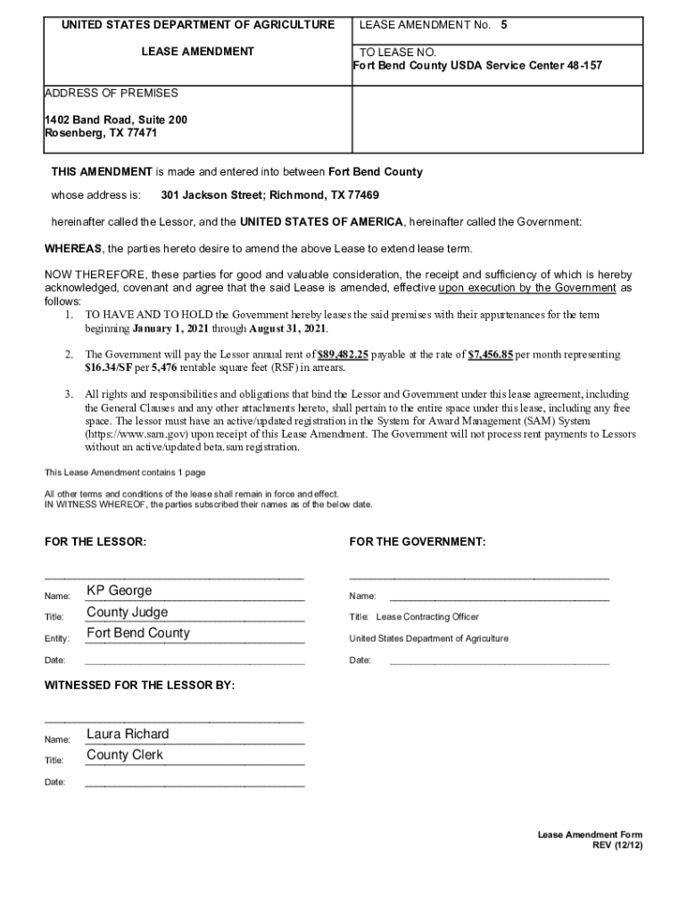 UNITED STATES DEPARTMENT OF AGRICULTURE LEASE AMENDMENTLEASE AMENDMENT No. 5 TO LEASE NO. Fort Bend County USDA Service Center 48157ADDRESS OF PREMISES 1402 Band Road, Suite 200 Rosenberg, TX 77471