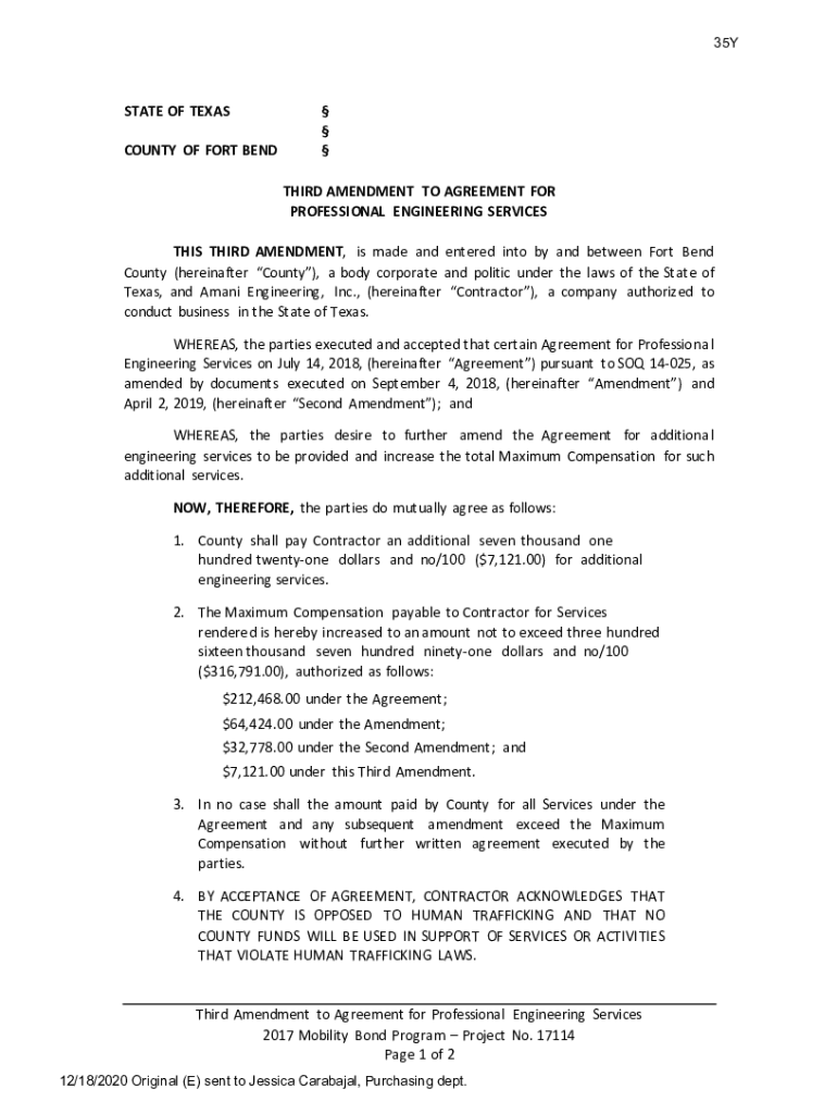35YSTATE OF TEXAS COUNTY OF FORT BEND THIRD AMENDMENT TO AGREEMENT FOR PROFESSIONAL ENGINEERING SERVICESTHIS THIRD AMENDMENT, is made and entered into by and between Fort Bend County (hereinafter