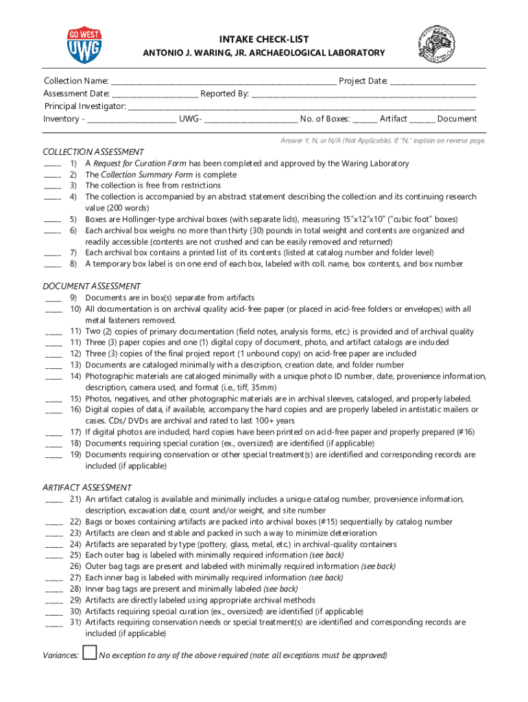 INTAKE CHECKLISTANTONIO J. WARING, JR. ARCHAEOLOGICAL LABORATORY Collection Name: ___ Project Date: ___ Assessment Date: ___ Reported By: ___ Principal Investigator: ___ Inventory ___ USG ___ No.