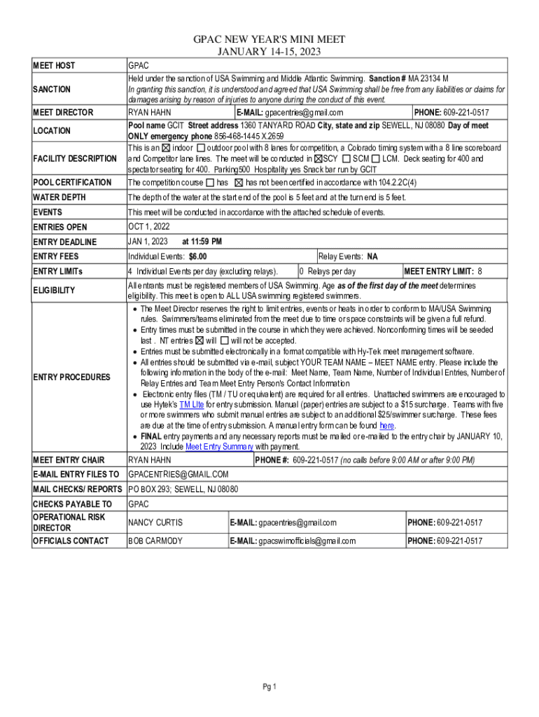 GPA NEW YEAR\'S MINI MEET JANUARY 1415, 2023 MEET HOSTEL CERTIFICATIONGPAC Held under the sanction of USA Swimming and Middle Atlantic Swimming. Sanction # MA 23134 M In granting this sanction, it