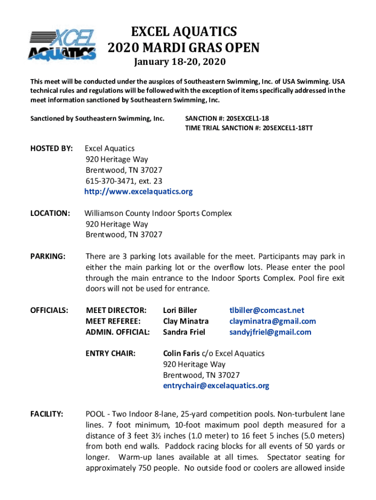 EXCEL AQUATICS2020 MARDI GRAS OPEN January 1820, 2020This meet will be conducted under the auspices of Southeastern Swimming, Inc. of USA Swimming. USA technical rules and regulations will be followed