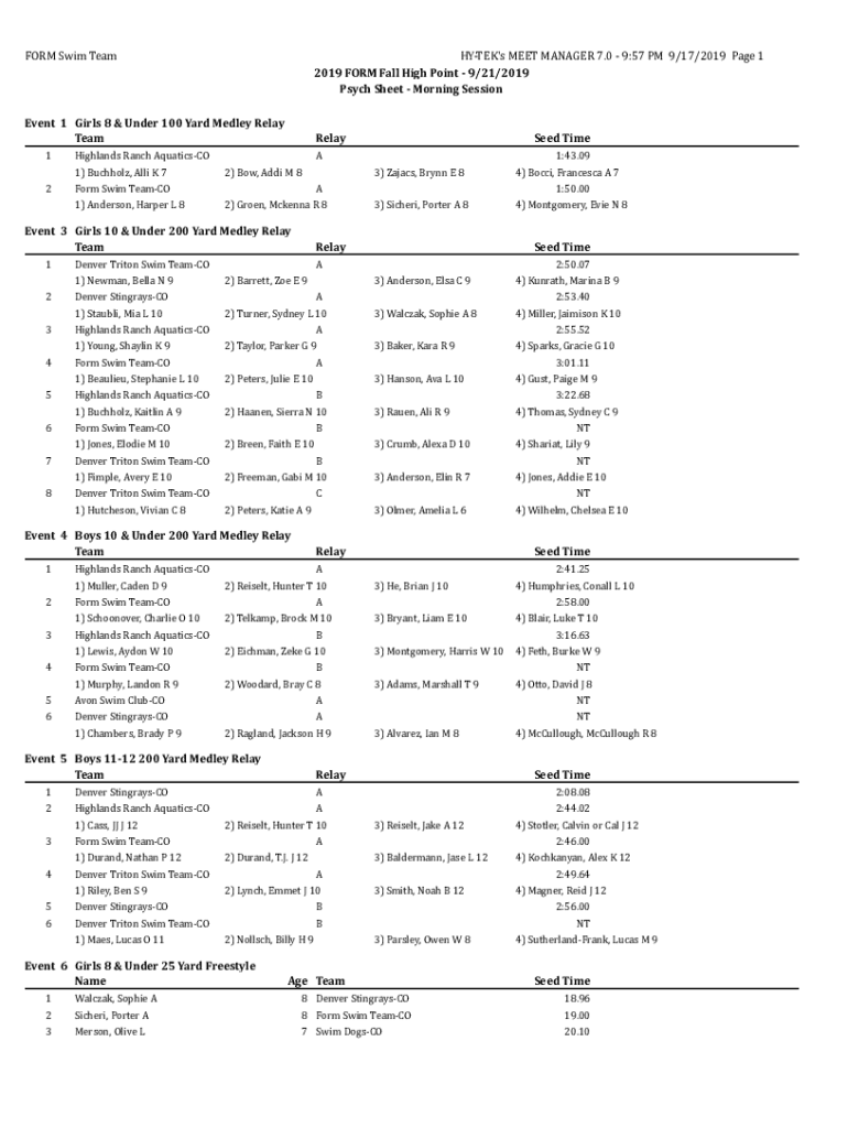 FORM Swim Teammate\'s MEET MANAGER 7.0 9:57 PM 9/17/2019-Page 1 2019 FORM Fall High Point 9/21/2019 Psych Sheet Morning SessionEvent 1 Girls 8 & Under 100 Yard Medley Relay Team 1 2Highlands Ranch