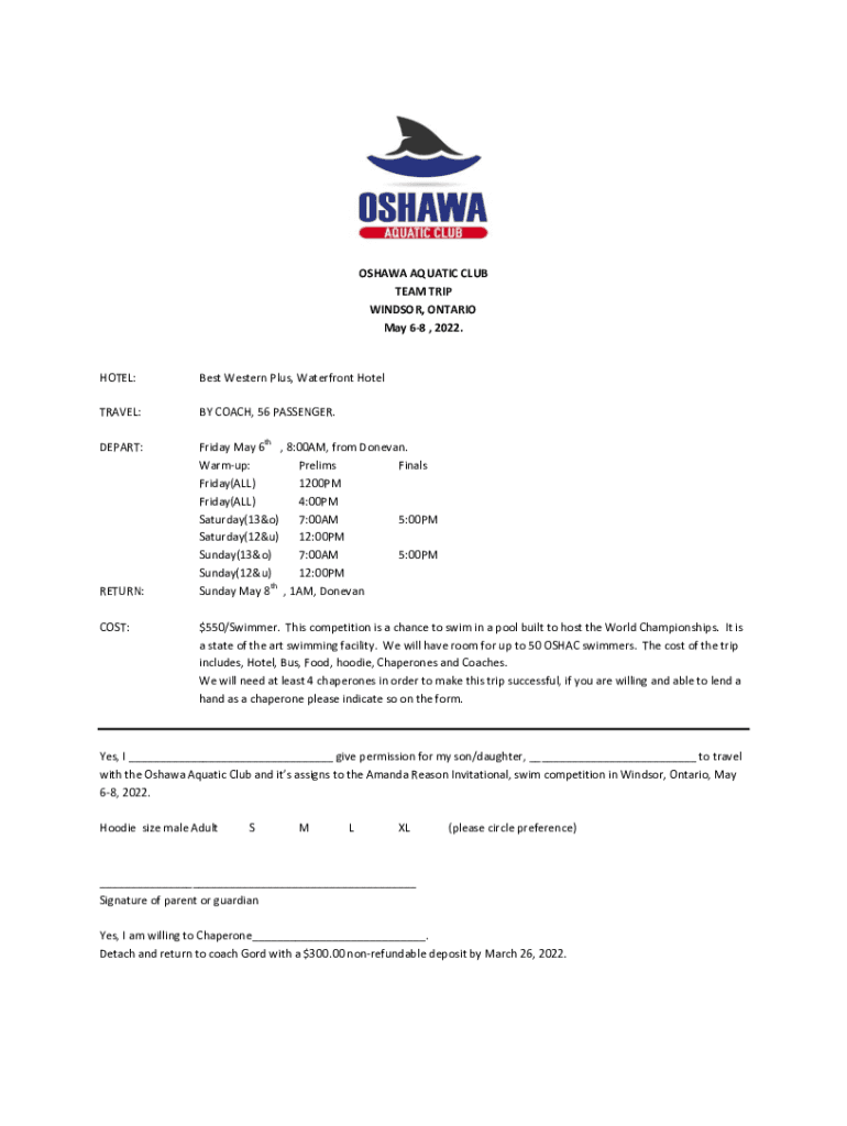 OSHAWA AQUATIC CLUB TEAM TRIP WINDSOR, ONTARIO May 68, 2022.HOTEL:Best Western Plus, Waterfront HotelTRAVEL:BY COACH, 56 PASSENGER.DEPART:Friday, May 6, 8:00AM, from Donovan. Warm up: Prelims Finals