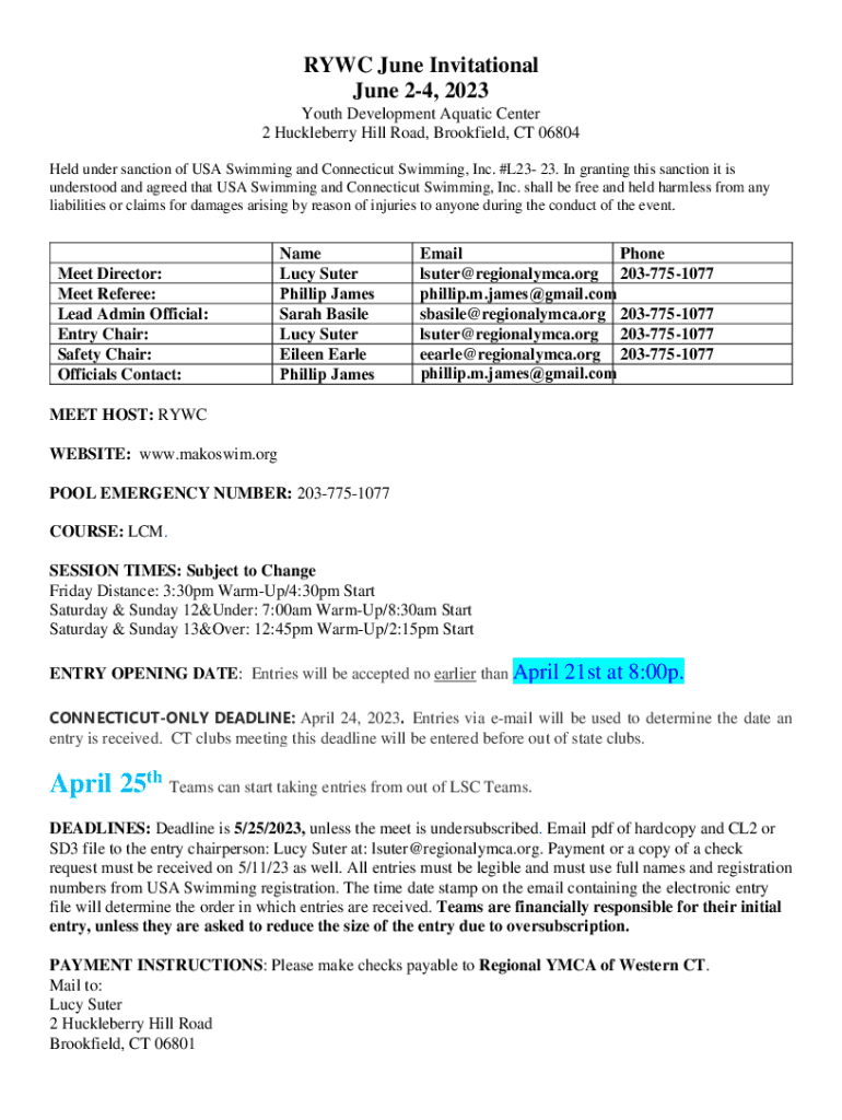 RAW June Invitational June 24, 2023, Youth Development Aquatic Center 2 Huckleberry Hill Road, Brookfield, CT 06804 Held under sanction of USA Swimming and Connecticut Swimming, Inc. #L23 23. In granting