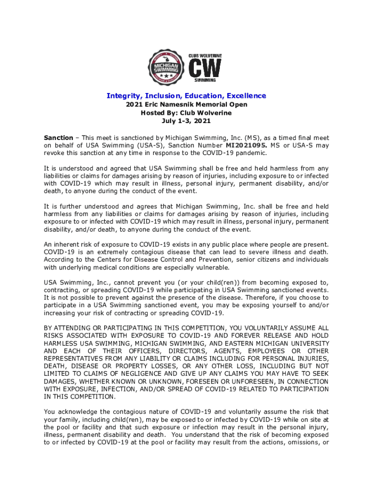 Integrity, Inclusion, Education, Excellence 2021 Eric Names Memorial Open Hosted By: Club Wolverine July 13, 2021, Sanction This meet is sanctioned by Michigan Swimming, Inc. (MS), as a timed final