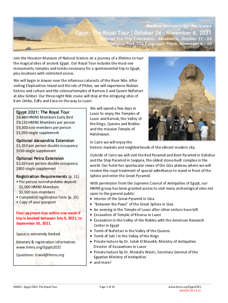 HOUSTON MUSEUM OF NATURAL SCIENCE Egypt: The Royal Tour | October 24 November 6, 2021Optional Pretoria Extensions: Alexandria, October 21 24 Optional Strip Extension: Petra, November 6 10Join the