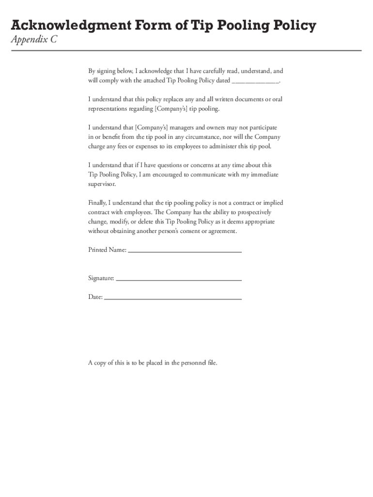 Acknowledgment Form of Tip Pooling Policy Appendix By signing below, I acknowledge that I have carefully read, understand, and will comply with the attached Tip Pooling Policy dated ___. I understand