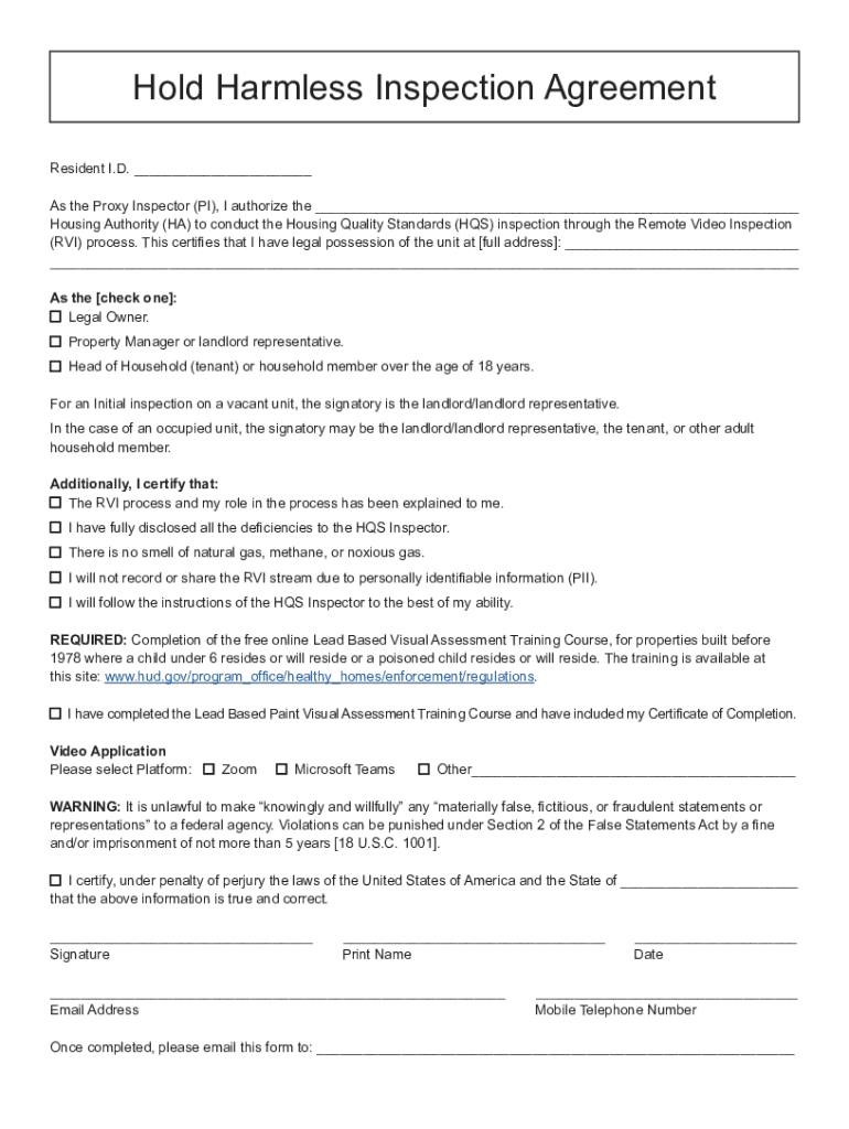 Hold Harmless Inspection Agreement Resident I.D. ___ As the Proxy Inspector (PI), I authorize the ___ Housing Authority (HA) to conduct the Housing Quality Standards (HIS) inspection through the Remote