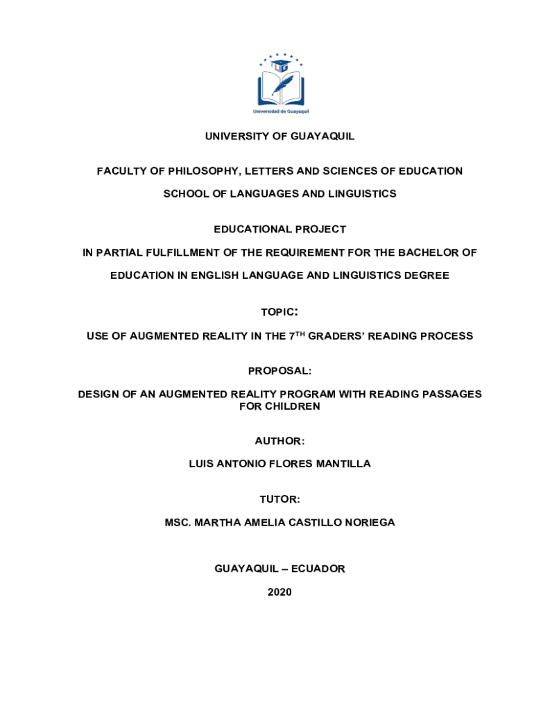 UNIVERSITY OF GUAYAQUIL FACULTY OF PHILOSOPHY, LETTERS AND SCIENCES OF EDUCATION SCHOOL OF LANGUAGES AND LINGUISTICS EDUCATIONAL PROJECT IN PARTIAL FULFILLMENT OF THE REQUIREMENT FOR THE BACHELOR