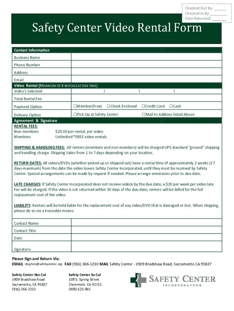 Checked Out By: ___ Checked In By:___ Date Returned: ___Safety Center Video Rental Recontact Information Business Telephone Number AddressEmail Video Rental (MAXIMUM OF 4 RENTALS AT ONE TIME) Video\'s