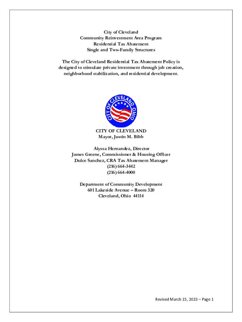 City of Cleveland Community Reinvestment Area Program Residential Tax Abatement Single and Family Structures The City of Cleveland Residential Tax Abatement Policy is designed to stimulate private
