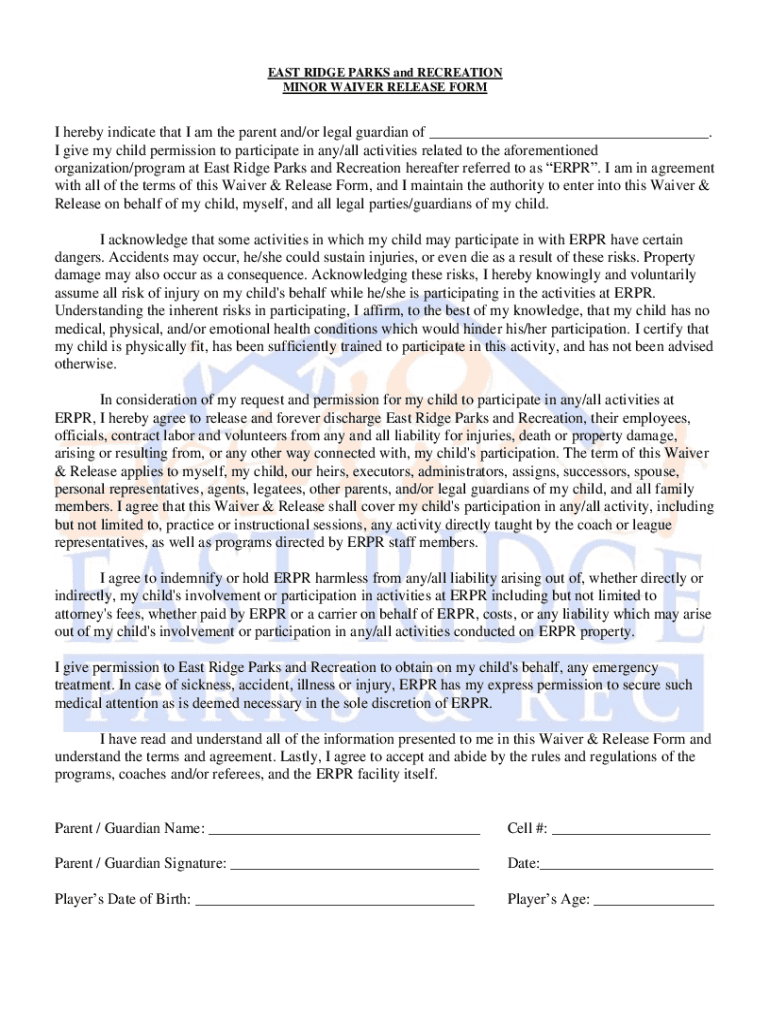 EAST RIDGE PARKS and RECREATION MINOR WAIVER RELEASE FORM hereby indicate that I am the parent and/or legal guardian of ___. I give my child permission to participate in any/all activities related