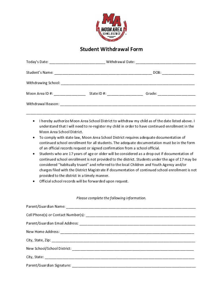 Student Withdrawal Form Today's Date: ___ Withdrawal Date: ___ Students Name: ___ DOB: ___ Withdrawing School: ___ Moon Area ID #: ___ State ID #: ___ Grade: ___ Withdrawal Reason: ___ ___ I hereby