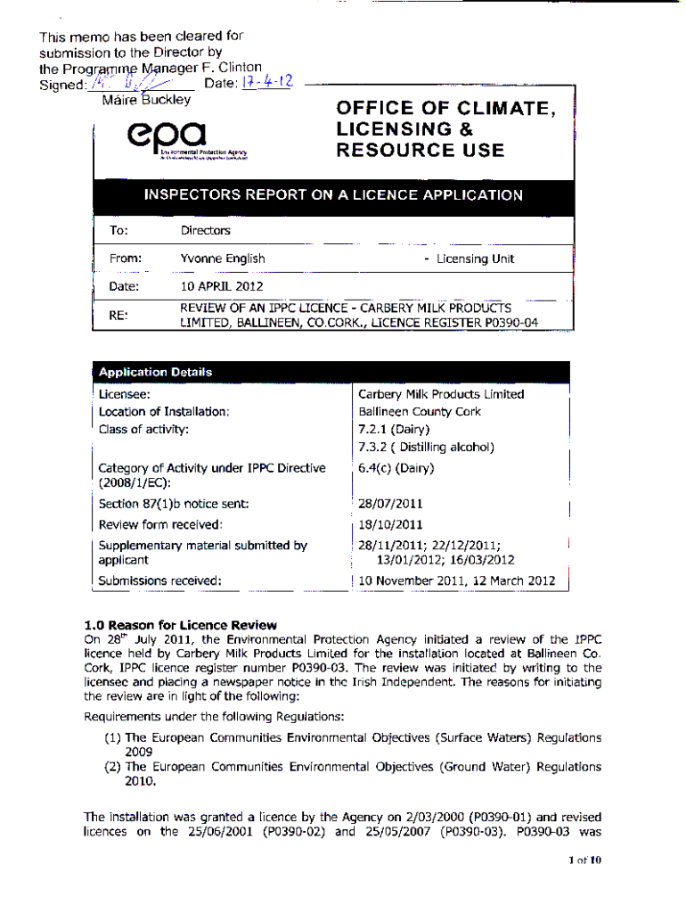 This memo has been cleared for submission to the Director by the ProgrcrJlT, pager F. Clinton Signed: / Date: 17 41 2(.1816sley OFFICE OF CLIMATE, LICENSING & RESOURCE USEI1INSPECTORS REPORT ON A