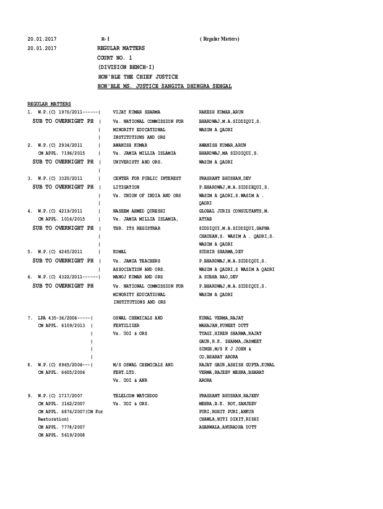 R 120.01.2017 20.01.2017(Regular Matters)REGULAR MATTERS COURT NO. 1 (DIVISION BENCH) HON\'BLE THE CHIEF JUSTICE HON\'BLE MS. JUSTICE SANG ITA BHANGRA SEHGALREGULAR MATTERS 1. W.P.© 1970/2011|VIJAY