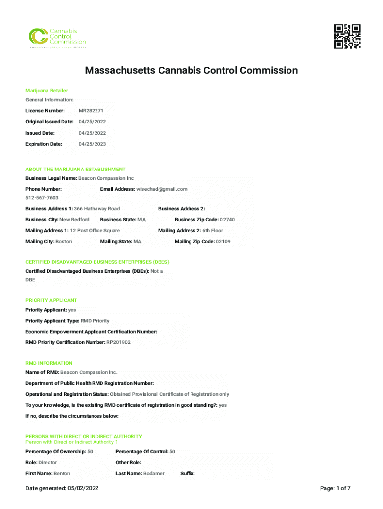 Massachusetts Cannabis Control Commission Marijuana Retailer General Information: License Number:MR282271Original Issued Date: 04/25/2022 Issued Date:04/25/2022Expiration Date:04/25/2023ABOUT THE
