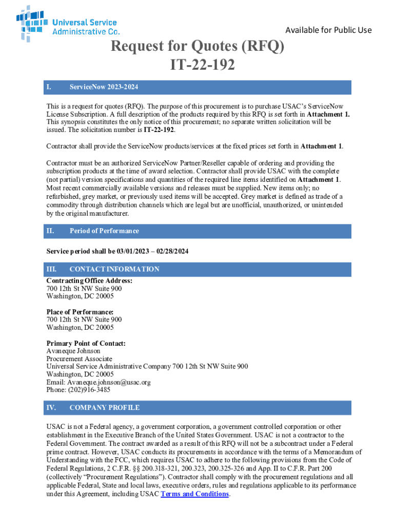 Request for Quotes (RFQ) IT22192 I. Available for Public ServiceNow 20232024This is a request for quotes (RFQ). The purpose of this procurement is to purchase Sacs ServiceNow License Subscription.