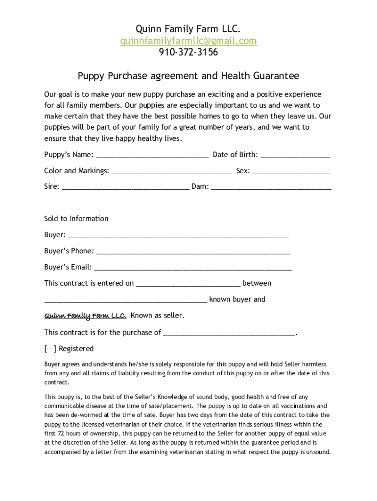 Quinn Family Farm LLC. quinnfamilyfarmllc@gmail.com 9103723156 Puppy Purchase agreement and Health Guarantee Our goal is to make your new puppy purchase an exciting and a positive experience for all