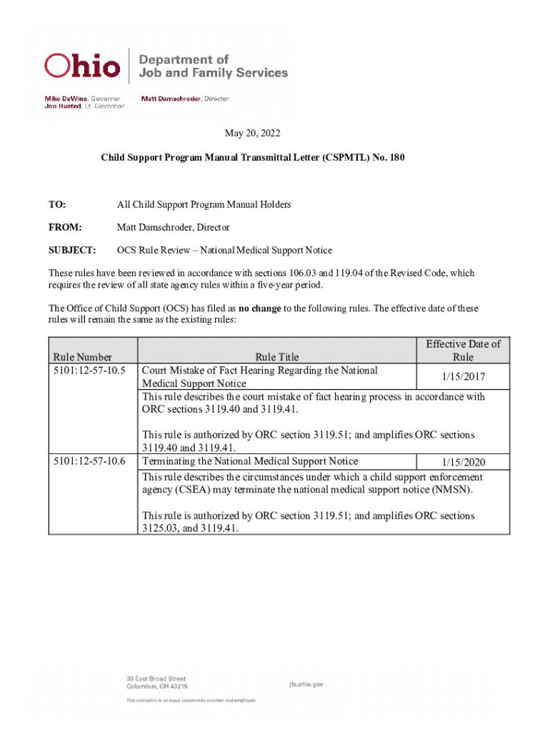 May 20, 2022, Child Support Program Manual Transmittal Letter (CSP MTL) No. 180TO:All Child Support Program Manual HoldersFROM:Matt Schröder, DirectorSUBJECT:OCS Rule Review National Medical Support