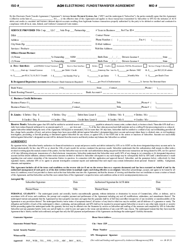 ISO #ACH ELECTRONIC FUNDS TRANSFER AGREEMENT MID #By this Electronic Funds Transfer Agreement (Agreement), between Secure Payment Systems, Inc. (SPS) and the undersigned (Subscriber), the parties