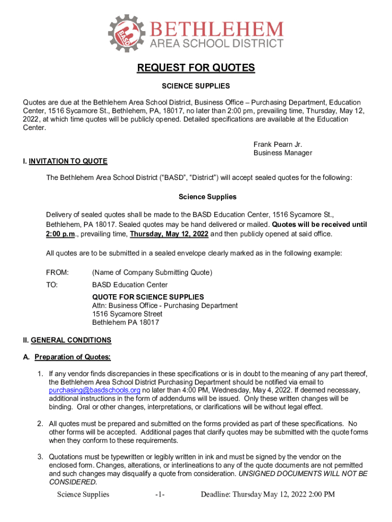 REQUEST FOR QUOTES SCIENCE SUPPLIES Quotes are due at the Bethlehem Area School District, Business Office Purchasing Department, Education Center, 1516 Sycamore St., Bethlehem, PA, 18017, no later