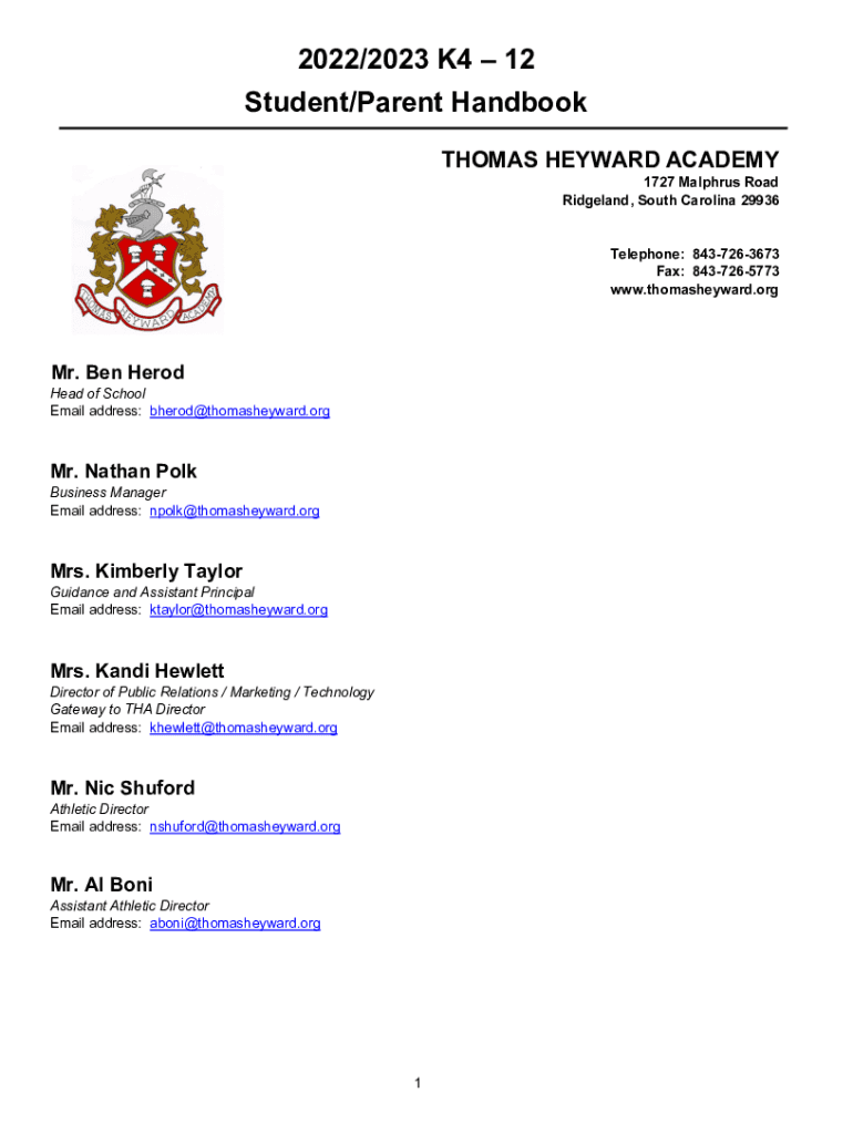 2022/2023 K4 12 Student/Parent Handbook THOMAS HAYWARD ACADEMY 1727 Malthus Road Ridgeland, South Carolina 29936Telephone: 8437263673 Fax: 8437265773 www.thomasheyward.orgMr. Ben Herod Head of School
