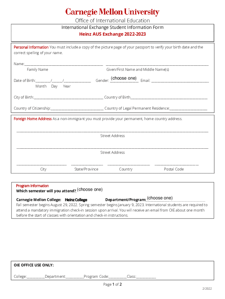 Office of International Education The information requested on the International Exchange Student Information (IMSI) form is required from you to issue a Certificate of Eligibility (I20) for Carnegie