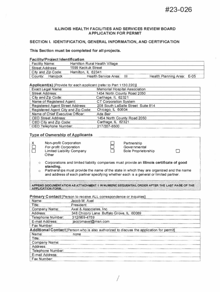 #23026 ILLINOIS HEALTH FACILITIES AND SERVICES REVIEW BOARD APPLICATION FOR PERMIT SECTION I. IDENTIFICATION, GENERAL INFORMATION, AND CERTIFICATION This Section must be completed for all projects.