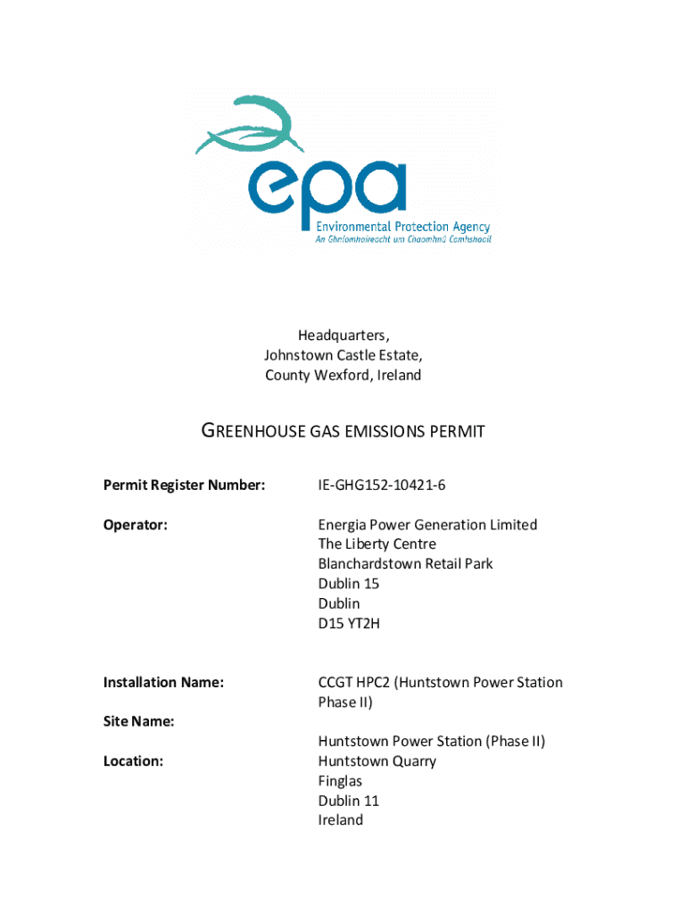Headquarters, Johnstown Castle Estate, County Oxford, IrelandGREENHOUSE GAS EMISSIONS PERMIT Register Number:IEGHG152104216Operator:Energy Power Generation Limited The Liberty Center Blanchardstown