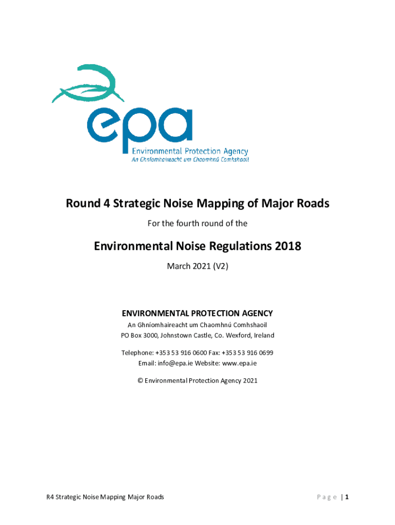 Round 4 Strategic Noise Mapping of Major Roads For the fourth round of environmental Noise Regulations 2018 March 2021 (V2)ENVIRONMENTAL PROTECTION AGENCY An Ghnomhaireacht um Chapman Comhshaoil PO