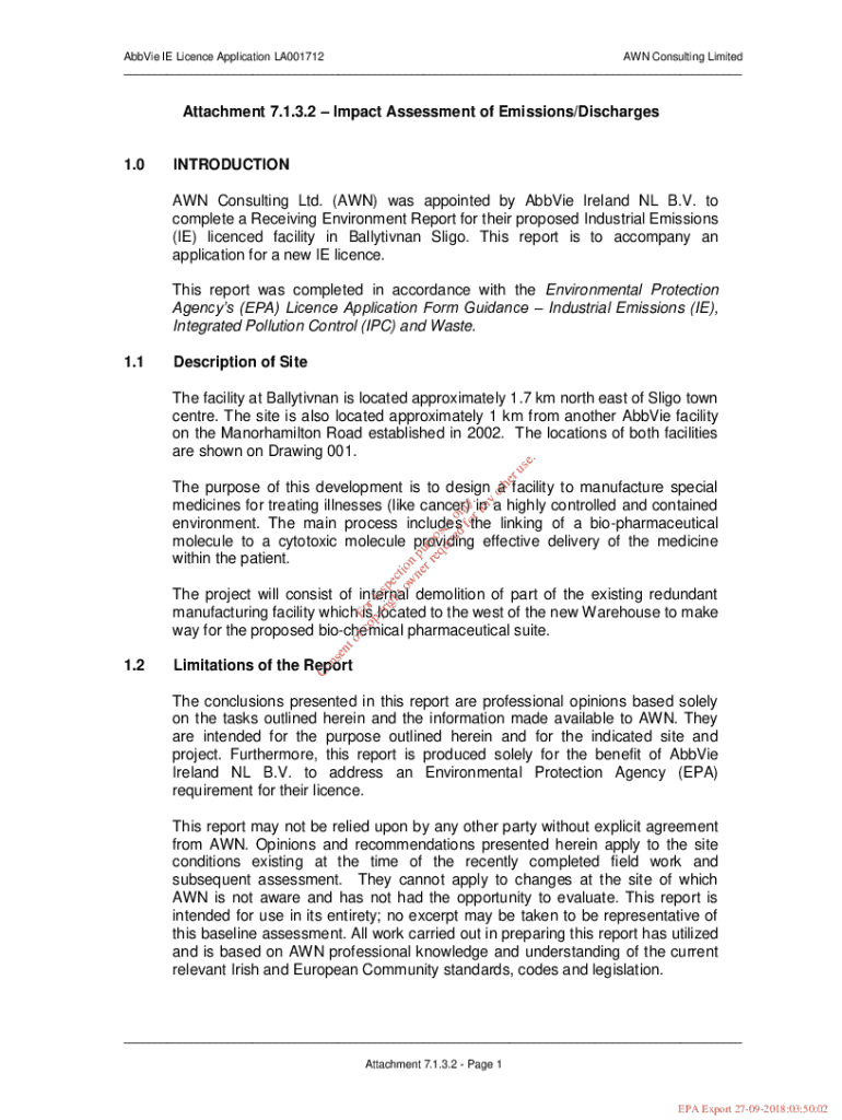 Abbie IE License Application LA001712 AWN Consulting Limited ___Attachment 7.1.3.2 Impact Assessment of Emissions/Discharges1.0INTRODUCTION AWN Consulting Ltd. (AWN) was appointed by Abbie Ireland