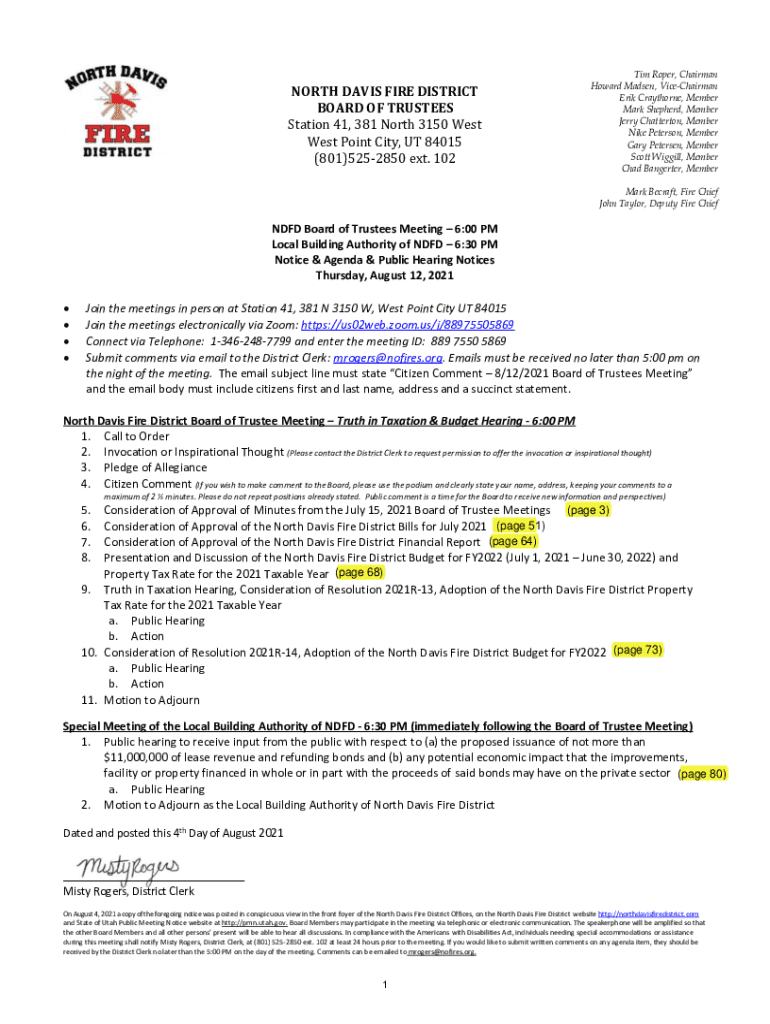 NORTH DAVIS FIRE DISTRICT BOARD OF TRUSTEES Station 41, 381 North 3150 West Point City, UT 84015 (801)5252850 ext. 102Tim Roper, Chairman Howard Madsen, ViceChairman Erik Clawthorne, Member Mark Shepherd,