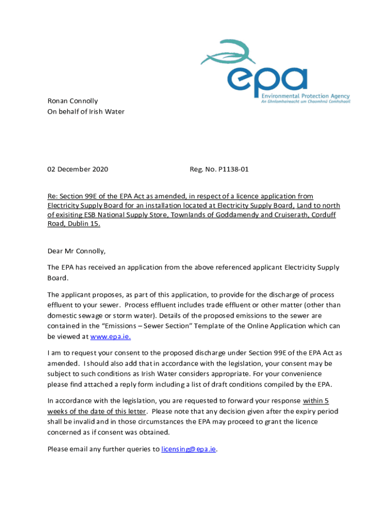 Roman Connolly On behalf of Irish Water02 December 2020Reg. No. P113801Re: Section 99E of the EPA Act as amended, in respect of a license application from Electricity Supply Board for an installation