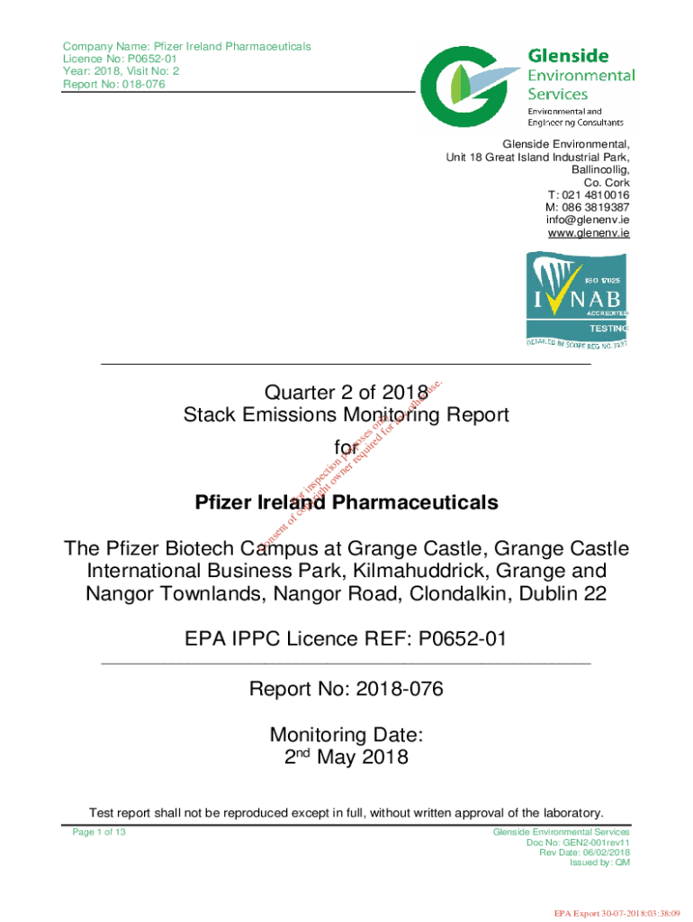 Company Name: Pfizer Ireland Pharmaceuticals License No: P065201 Year: 2018, Visit No: 2 Report No: 018076Glenside Environmental, Unit 18 Great Island Industrial Park, Ballincollig, Co. Cork T: 021