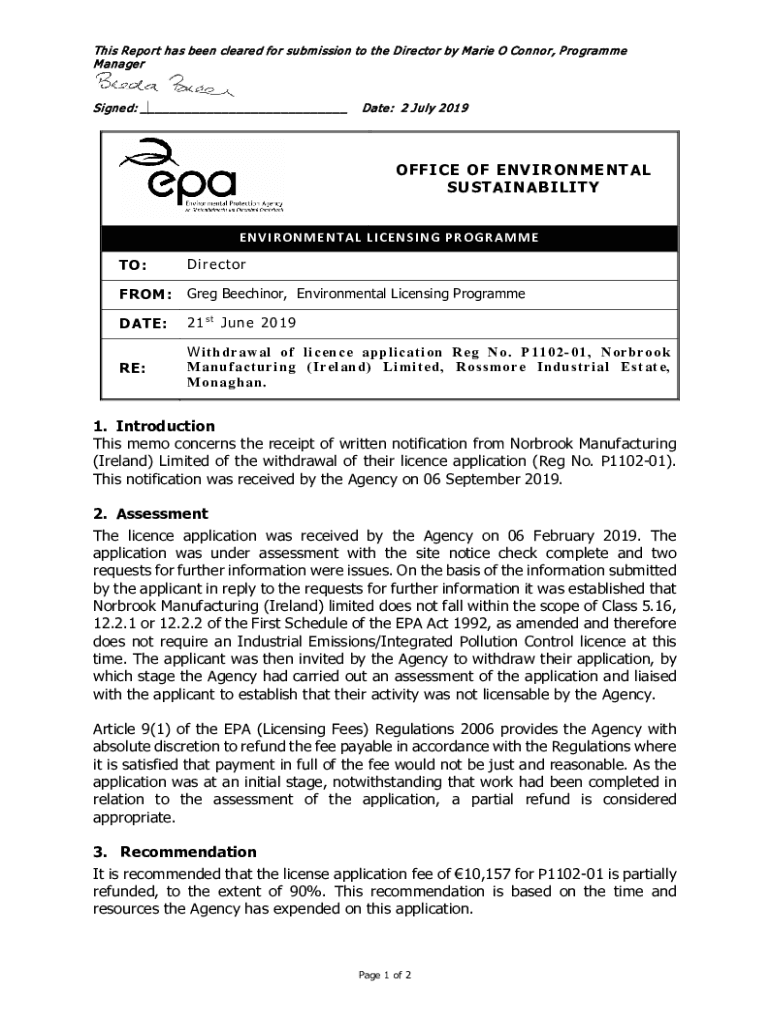 This Report has been cleared for submission to the Director by Marie O'Connor, Program m e M undersigned: _ ___Date: 2 July 2019OFFICE OF ENVIRONMENTAL SUSTAINABILITY ENVIRONMENTAL LICENSING Program