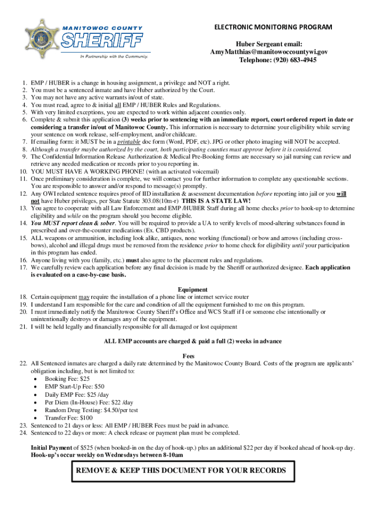ELECTRONIC MONITORING PROGRAM Huber Sergeant email: AmyMatthias@manitowoccountywi.gov Telephone: (920) 6834945 1. 2. 3. 4. 5. 6.7. 8. 9. 10. 11. 12. 13. 14. 15.16. 17.EMP / HUBER is a change in housing